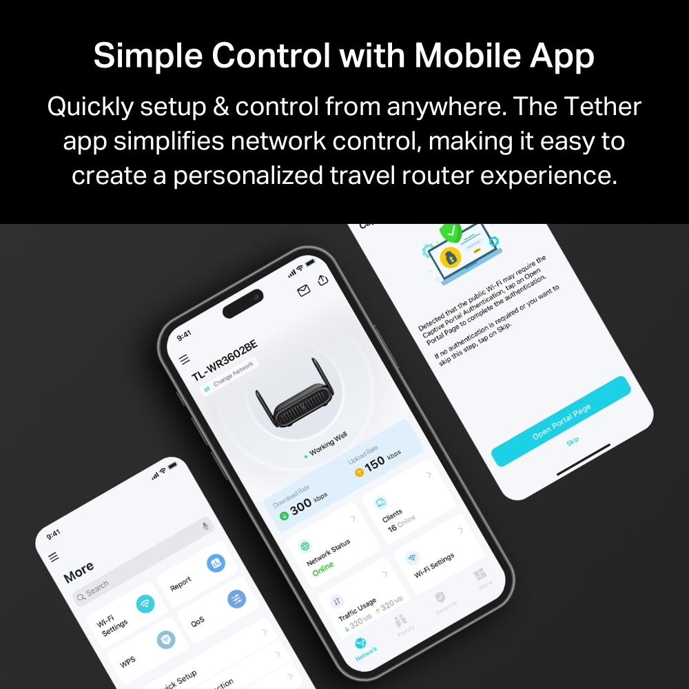 Schnelle Einrichtung und Steuerung von überall aus. Die Tether-App vereinfacht die Netzwerksteuerung und macht es ganz einfach, ein personalisiertes Reise-Router-Erlebnis zu schaffen.