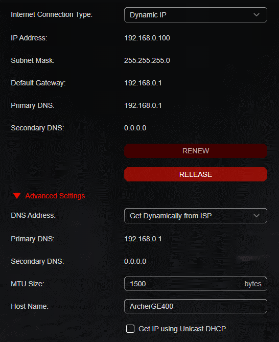 2) Dynamic IP(SLAAC/DHCPv6): Click Advanced Settings to input further information if your ISP requires. Click SAVE and then click Renew.