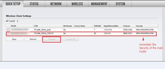 ![]() It will scan for all the available wireless networks, please find the main router/AP’s network, check the security type and click Connect. Here we take TP-Link_5GHz-C2FA7C as an example.