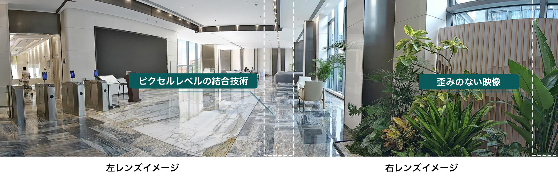 本製品は、デュアルレンズで捉えた映像をシームレスに融合する合成技術を採用。撮影箇所が重なった部分を最適化し、違和感なく自然に映し出せます。さらに、単一レンズ構成で生じやすい歪みを抑え、色彩や明るさを画面全体で均一に保つことで、より鮮明な映像を提供します。