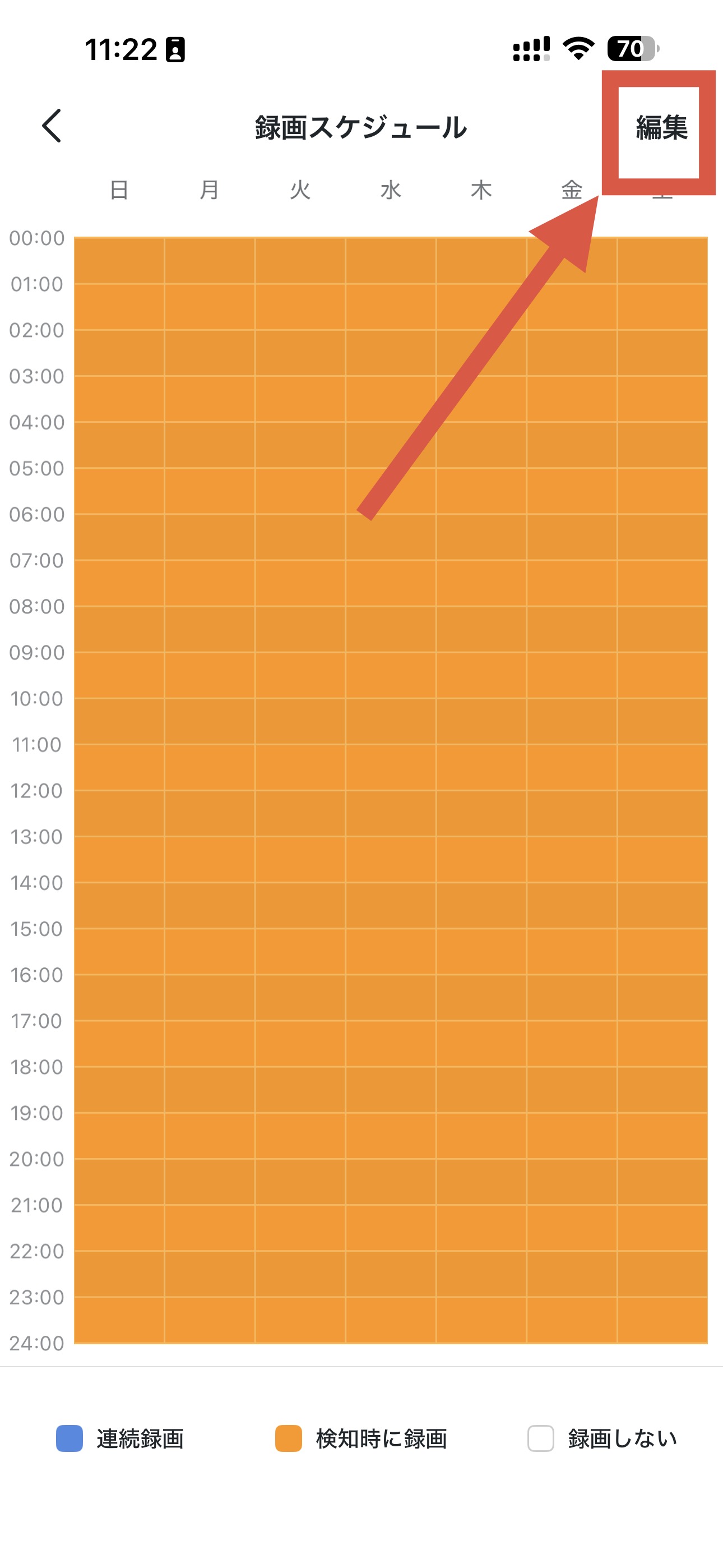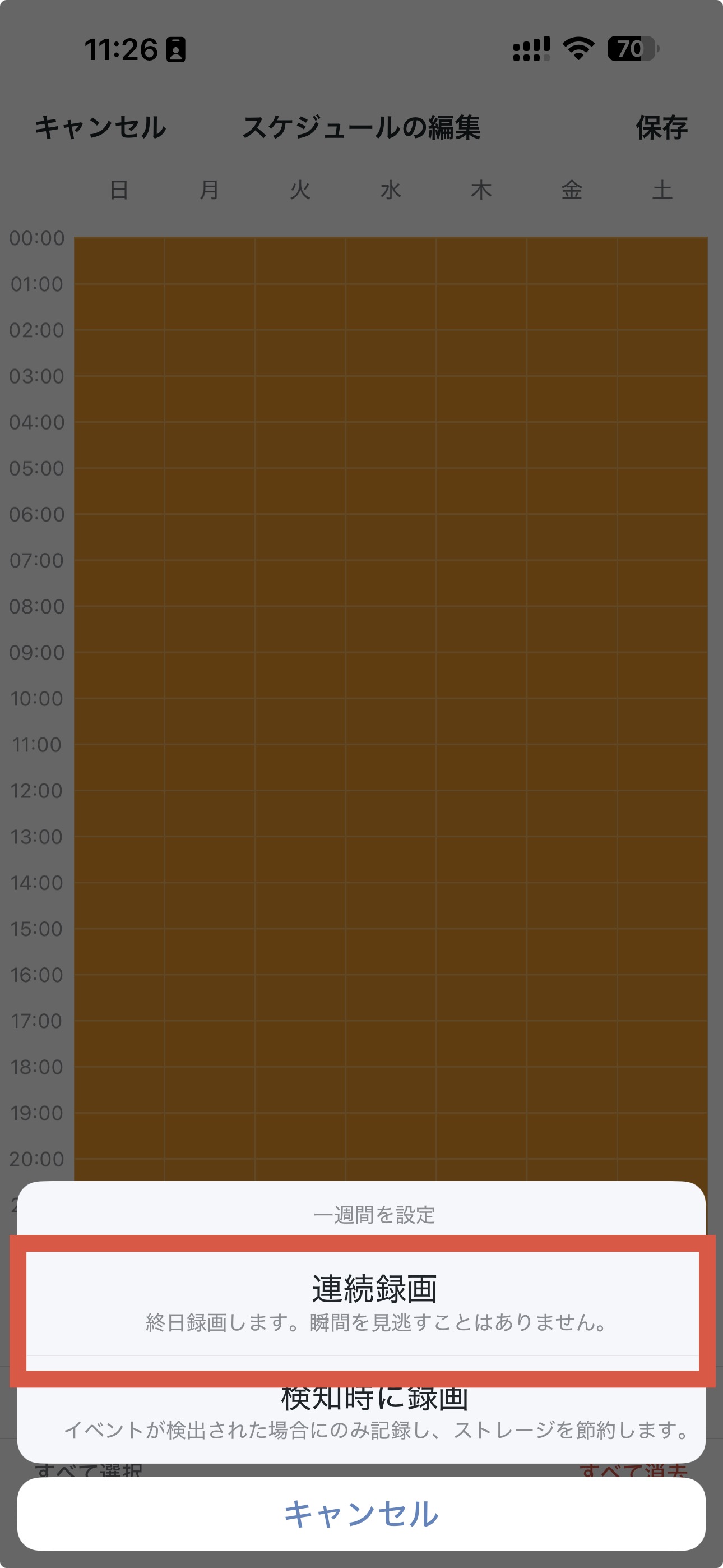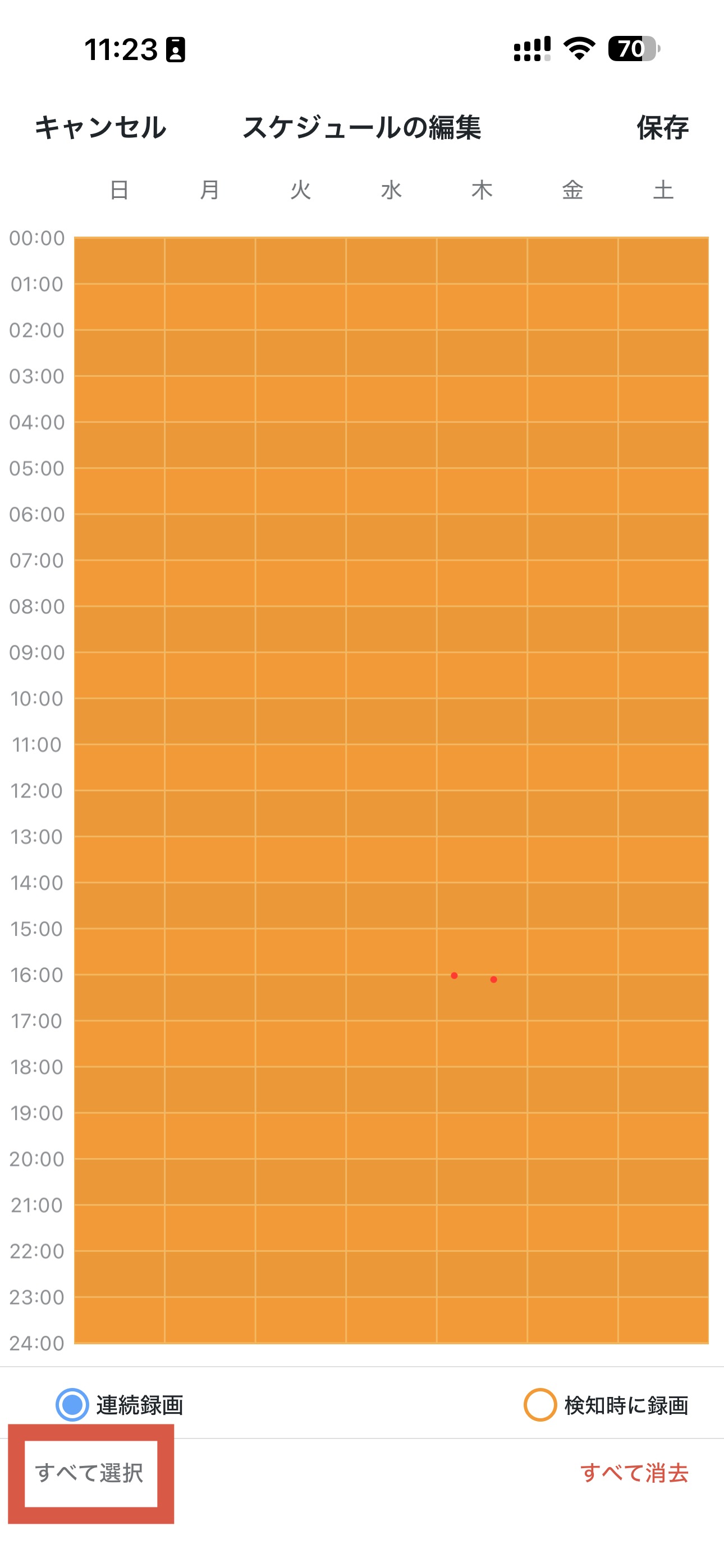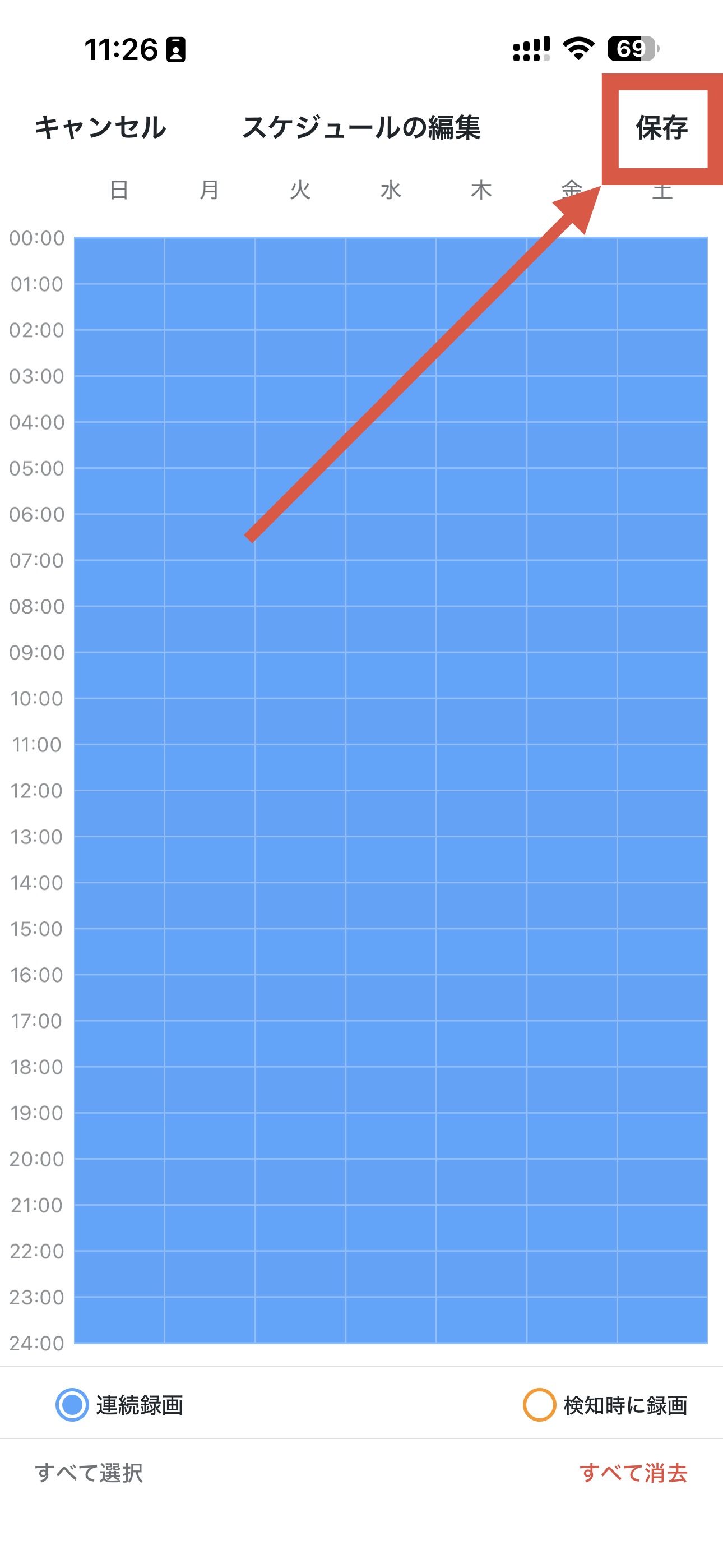 録画スケジュールページで、編集をタップ→、すべて選択をタップ→連続録画をタップし、右上隅にあるチェックアイコンもしくは保存ボタンをタップしてください。