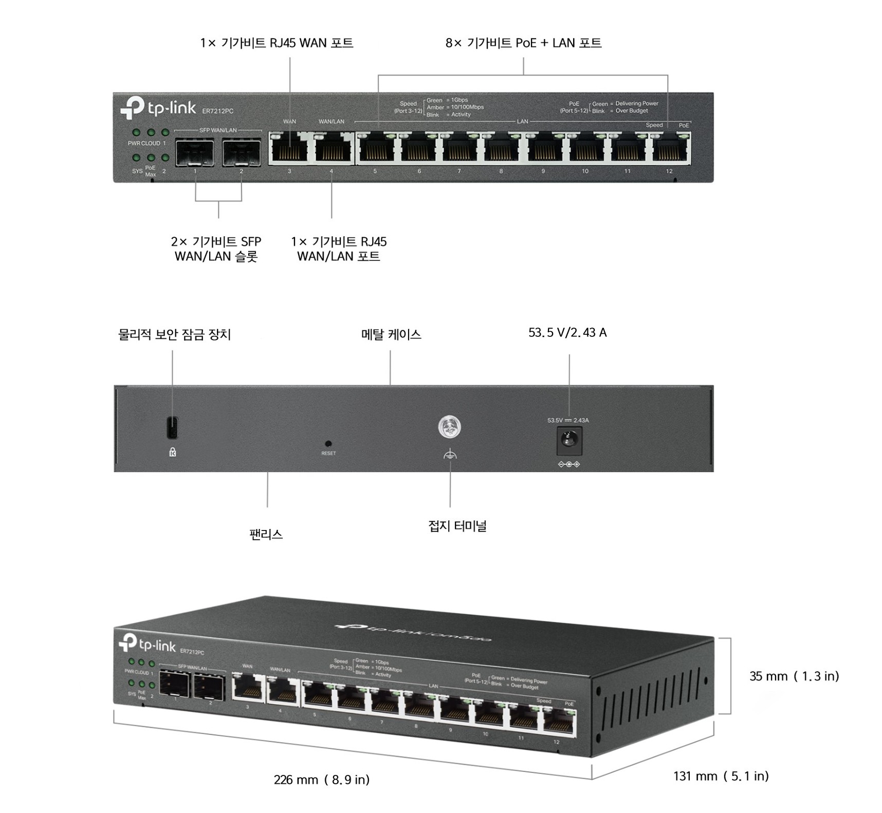 | 인터페이스 및 주요 사양 | • 2× 기가비트 SFP WAN/LAN 포트** • 1× 기가비트 WAN 포트 • 1× 기가비트 WAN/LAN 포트 • 8× 기가비트 LAN 포트 |
