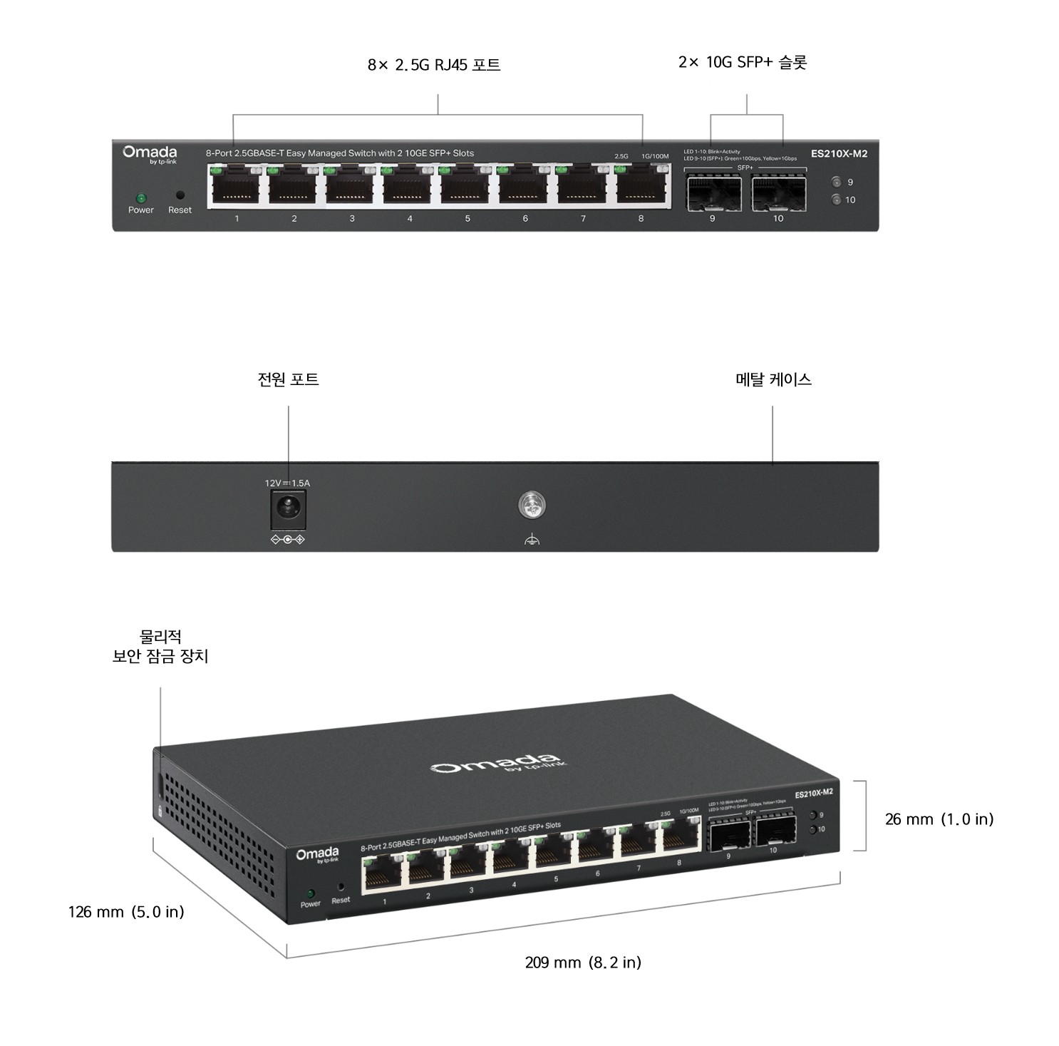 | 인터페이스 및 주요 사양 | • 8× 2.5 Gbps RJ45 포트 • 2× 10 Gbps SFP+ 슬롯 • 자동 협상/자동 MDI/MDIX |