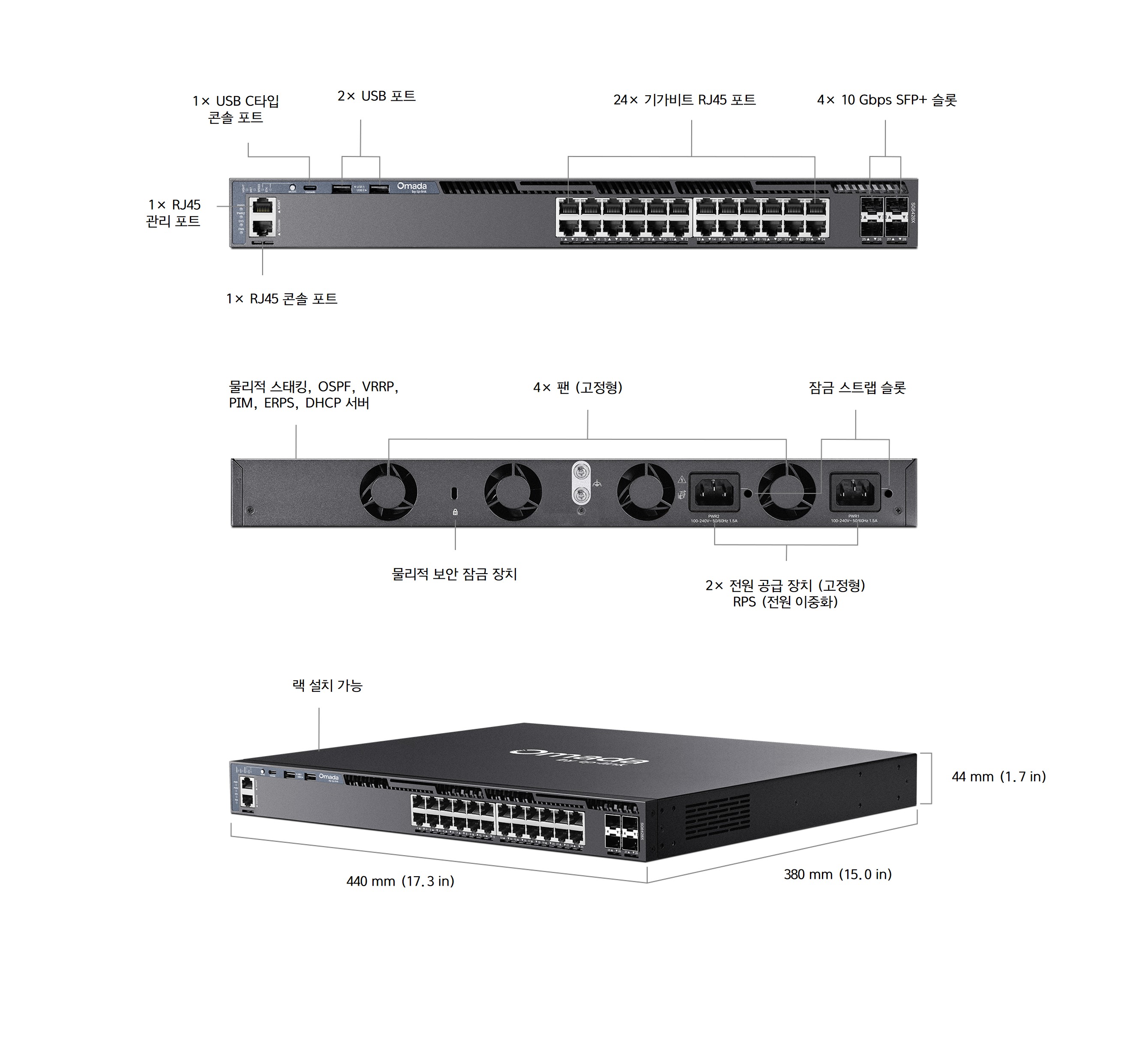 | 인터페이스 및 주요 사양 | • 24× 10/100/1000 Mbps RJ45 포트 • 4× 10G SFP+ 슬롯 • 2× USB 2.0 포트 • 1× RJ45 콘솔 포트 • 1× USB C타입 콘솔 포트 • 1× RJ45 관리 포트 |