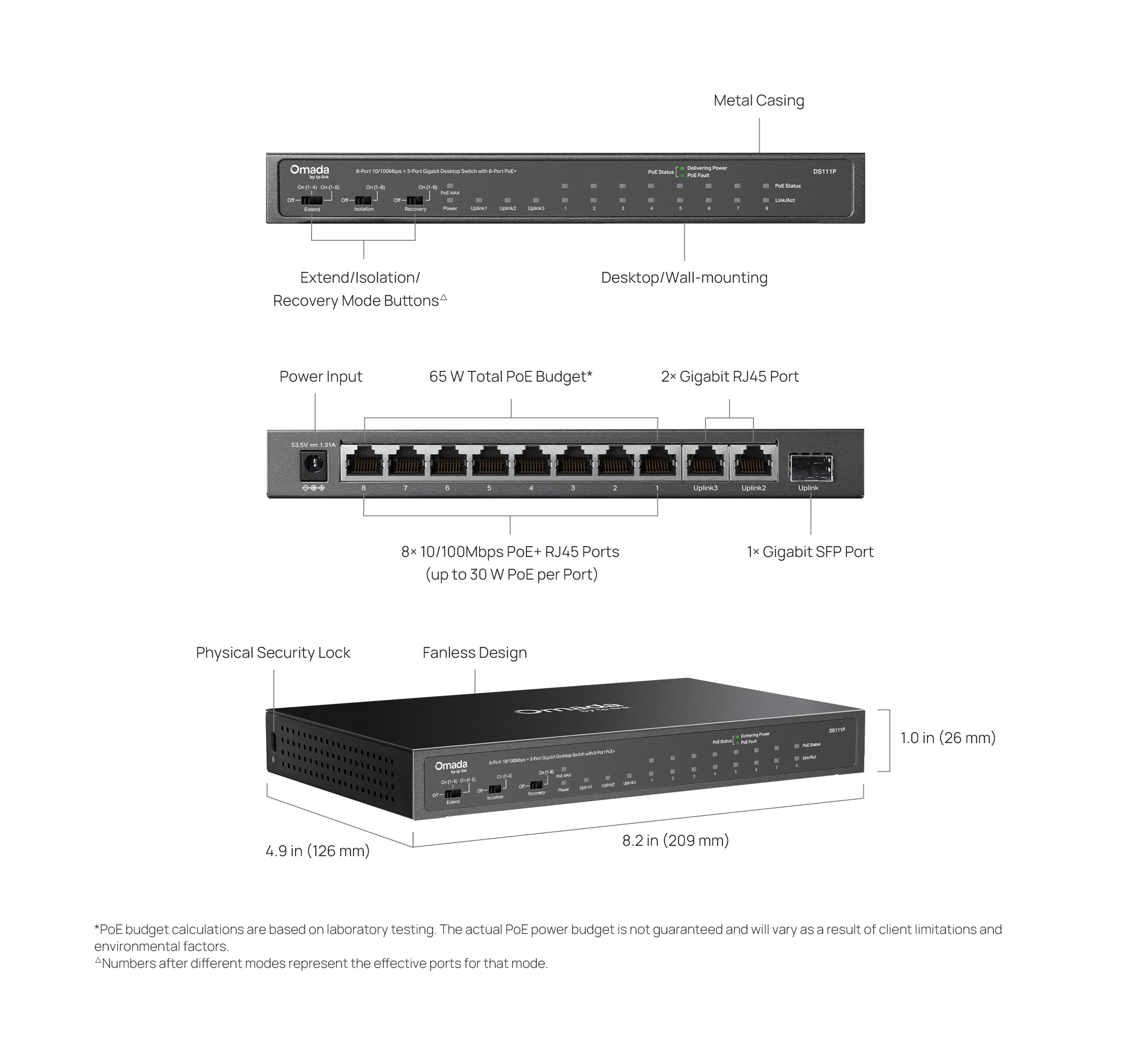 - Supports PoE Power up to 65 W for 8 PoE ports*
