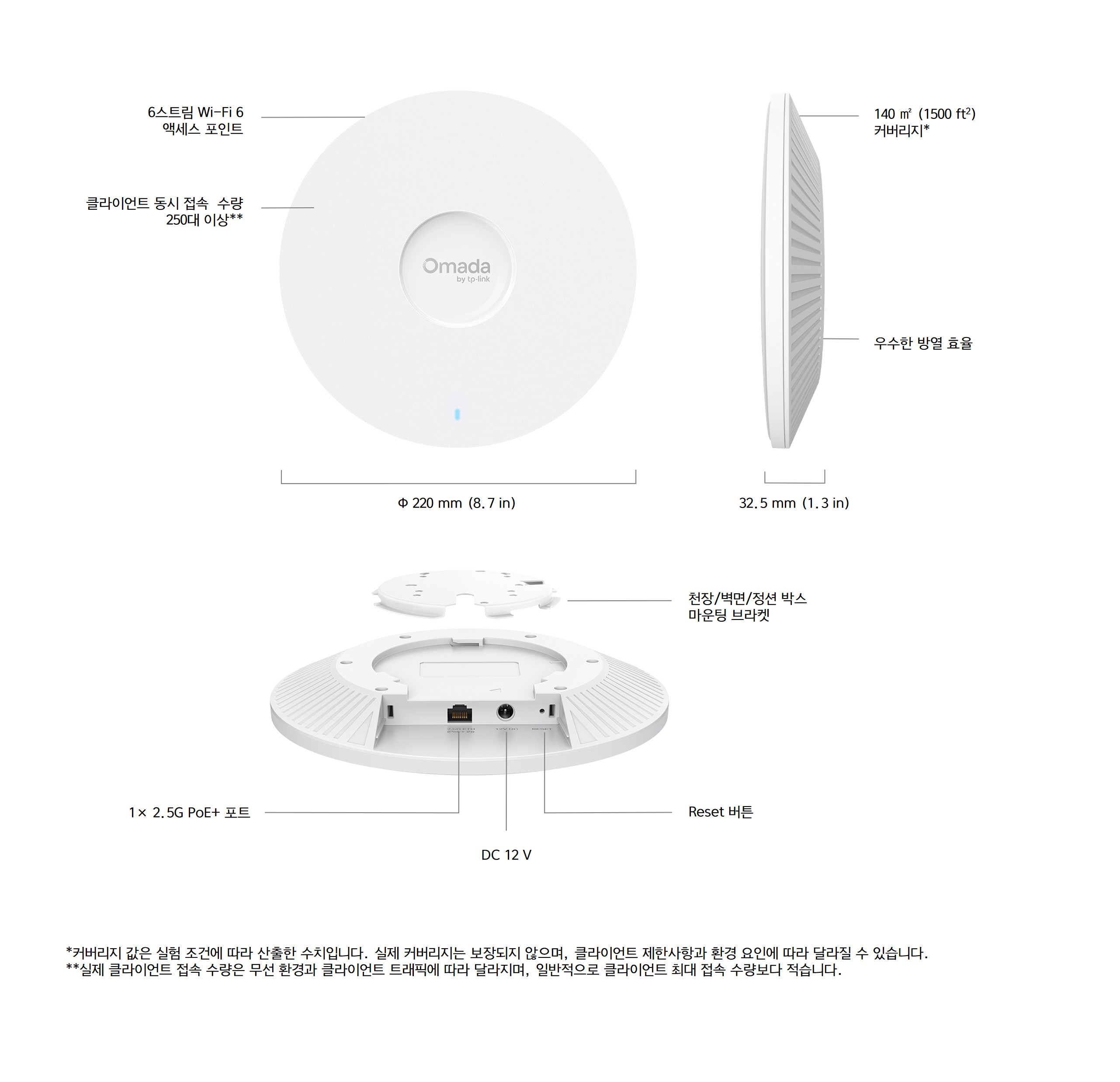 - 동시 접속 클라이언트 수 250대 이상**, 커버리지 최대 140 m²*