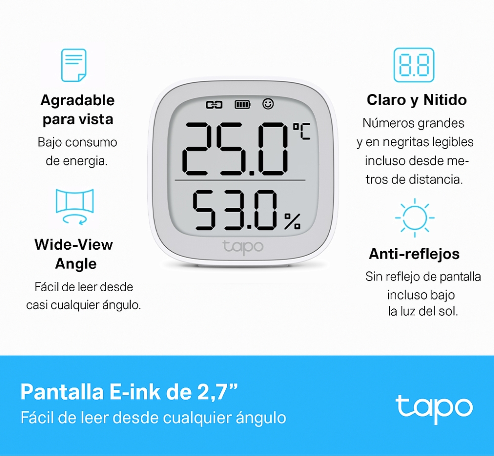 - Pantalla de tinta electrónica de 2,7". Conoce fa´cilmente la temperatura y humedad de casa con un solo vistazo.