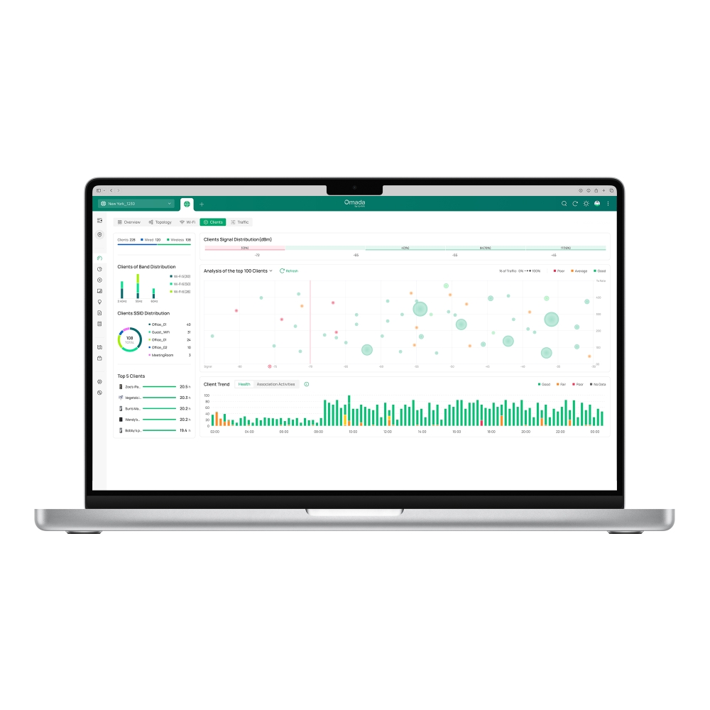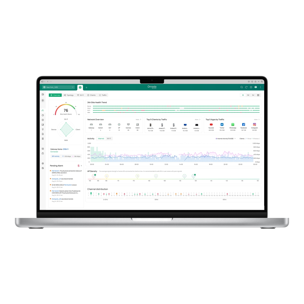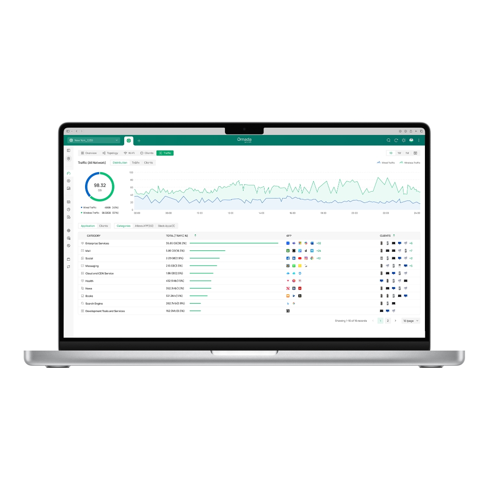 Kontroler programowy Omada (Omada Network Application) zarządza zdalnie lub lokalnie nielimitowaną ilością bram sieciowych, przełączników, punktów dostępowych i DeltaStream GPON OLT Omada poprzez aplikację Omada lub Interfejs Web.