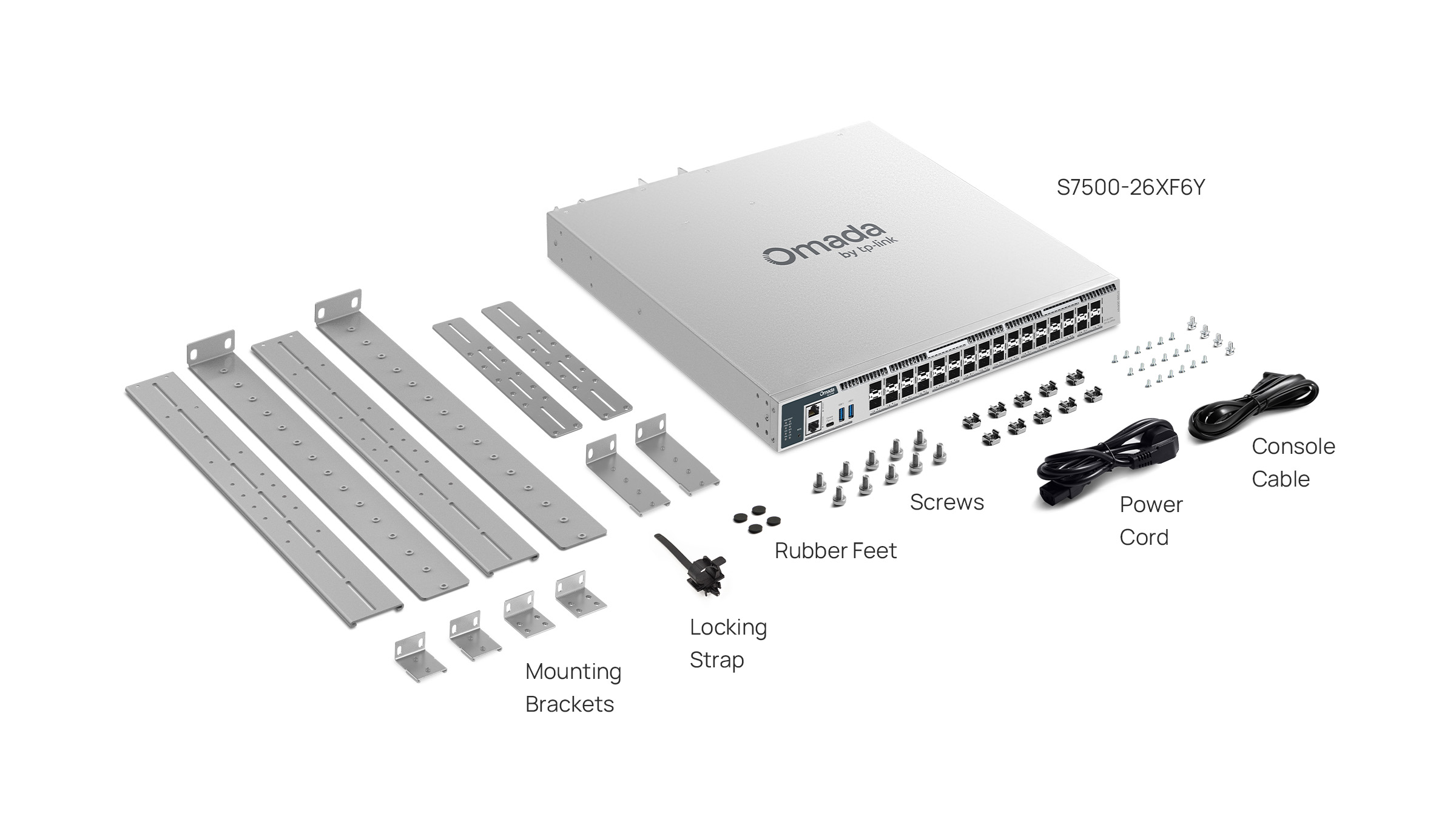 | Package Content | • S7500-26XF6Y Switch• Power Cord• Console Cable• Rackmount Kit• Rubber Feet• Locking Strap• Installation Guide |