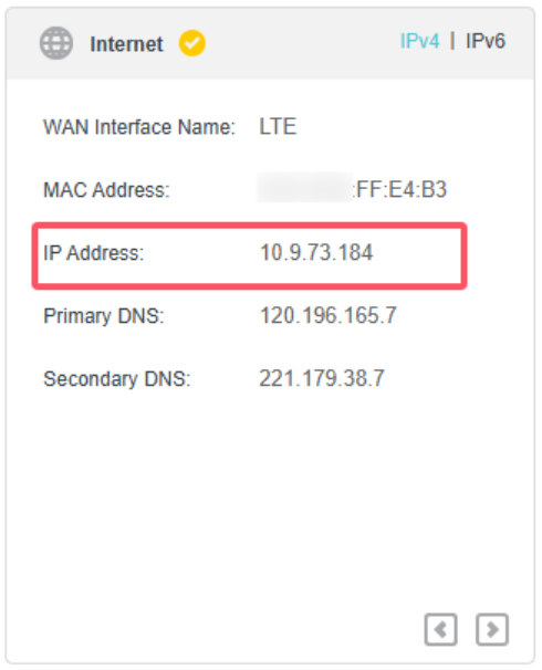 Đăng nhập vào giao diện quản lý web (tham khảo bài viết Cách đăng nhập vào giao diện quản lý web của router TP-Link Wireless 4G LTE để biết cách thực hiện) → vào Advanced → Status → kiểm tra địa chỉ IP trong mục Internet.