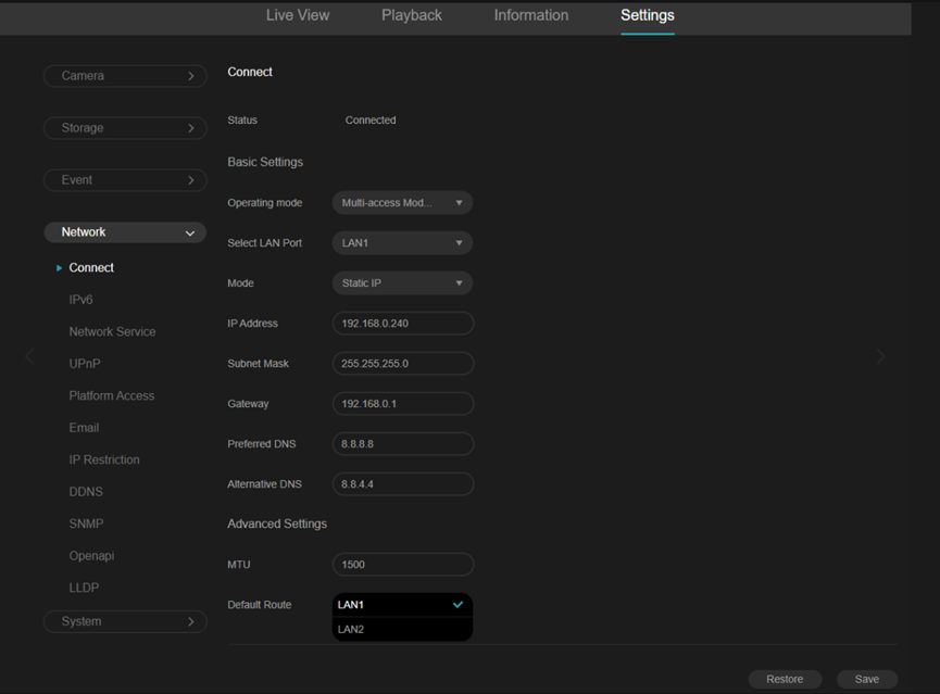- Nhấp chuột phải trên màn hình Live View, chọn Settings trong Main Menu, sau đó vào Network > Connect.